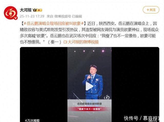 事情要从2025年11月9日的西安演唱会说起。当晚,岳云鹏一身红色亮片夹克,头顶“美式前刺”假发,修容妆容把下颌线勾勒得棱角分明,侧脸竟意外撞脸演员欧豪。眼尖的观众发现这一亮点后,现场立刻响起整齐划一的“欧豪”呼声,有人甚至搞笑形容他是“欧豪ProMax远峰蓝200kg版”。起初岳云鹏还一脸懵,但迅速接住这“飞来横梗”,即兴把歌词改成:“我叫你一声欧豪,你敢答应吗?”并高声宣布“今晚在西安,我叫岳云豪!”——这段互动被粉丝疯狂传播,成了全网热梗。